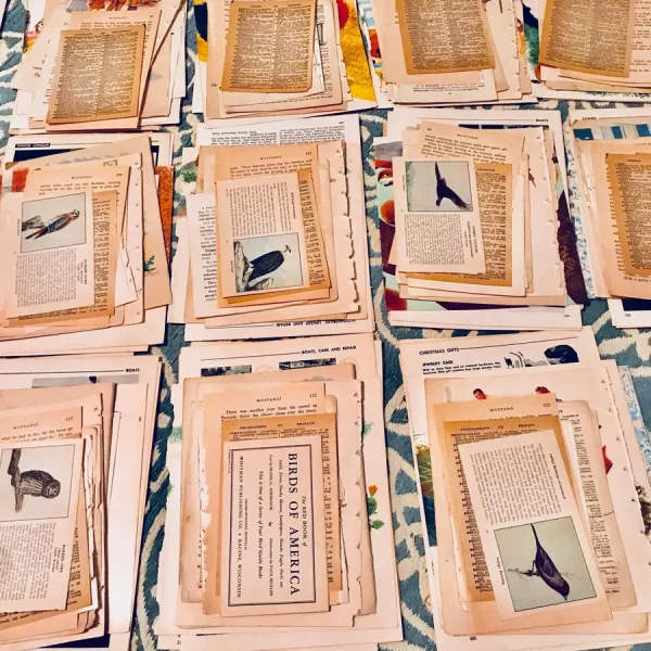 A pretty pile of sweet and unique vintage book pages from lots of sources, including children’s books, dictionaries of various types and sizes, fiction, readers, etc.