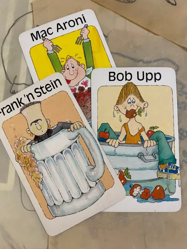 These Old Maid cards are jumbo-sized and so silly! I remember all the dad jokes of the 80s that these are puns of. Kids!
