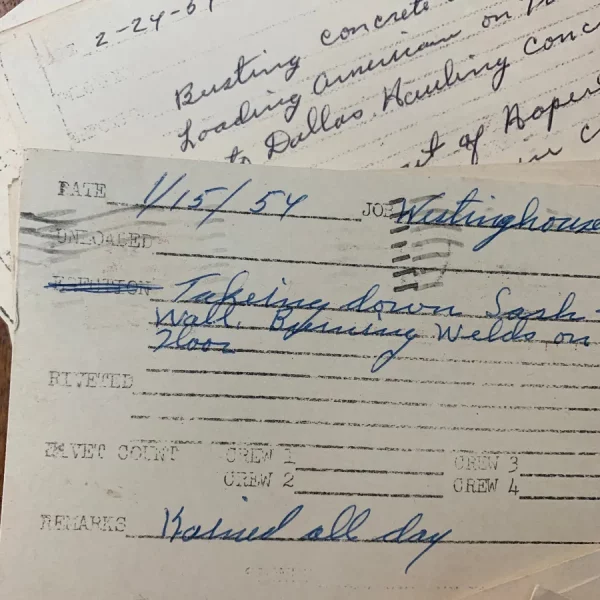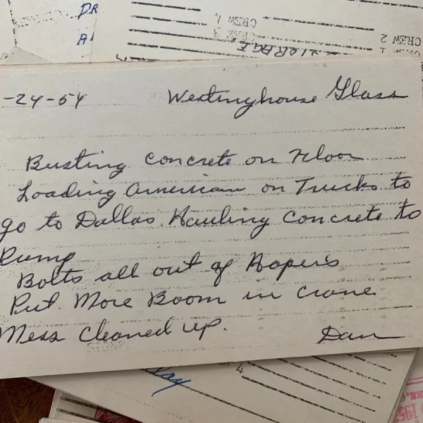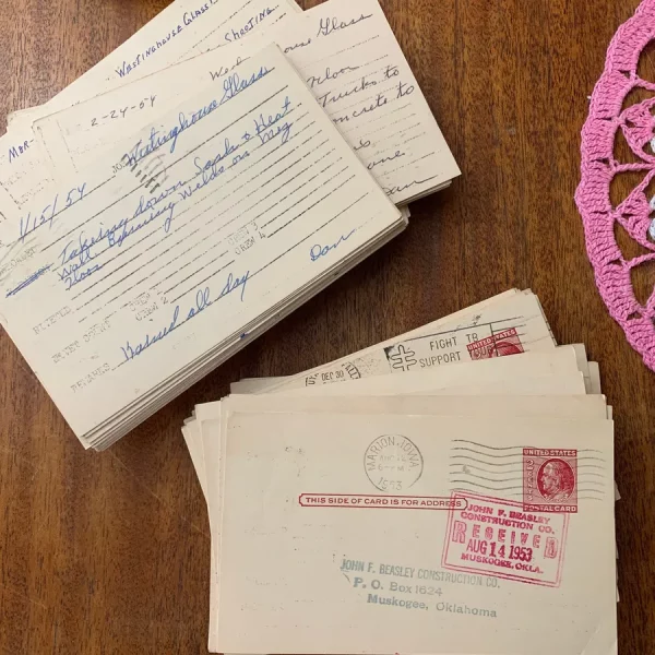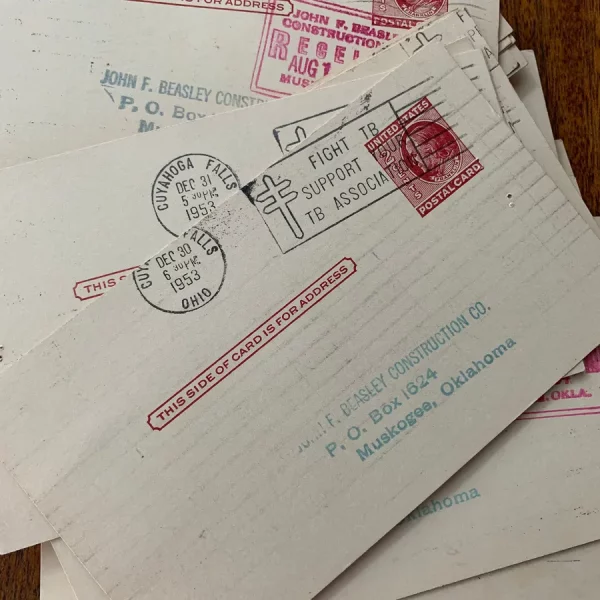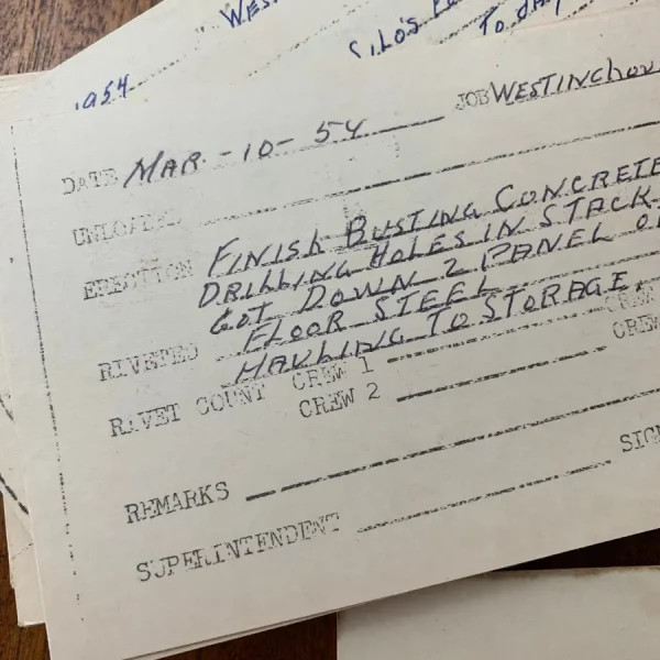 A fun, huge find at a local estate sale…job cards from a construction company worker in the 50s! The cards vary in the style of post, date, and print on the back, but each describes a job completed, where, and who for. Really neat!