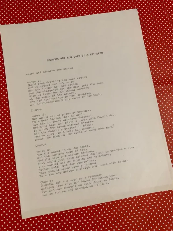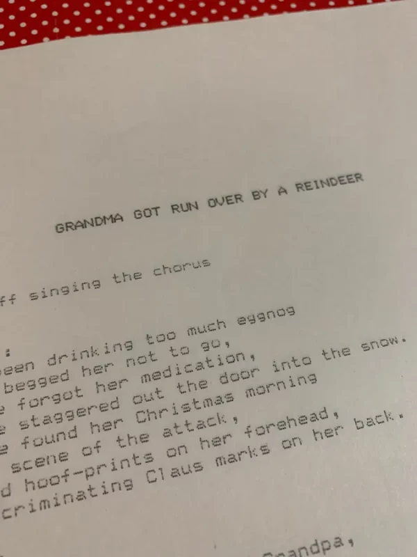 Grandma Got Run Over by a Reindeer Dot Matrix Printed for Christmas Carols Caroling Songs Holiday Entertainment Ephemera Vintage Paper