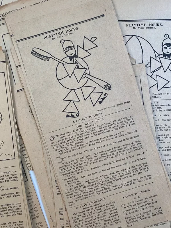 My Great-Grandma’s Vintage Newspaper Clippings of Crafts for Children Paper Pipe Cleaners Ribbon for Holiday Gifts from Kids Junk Journal