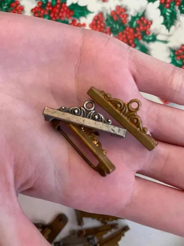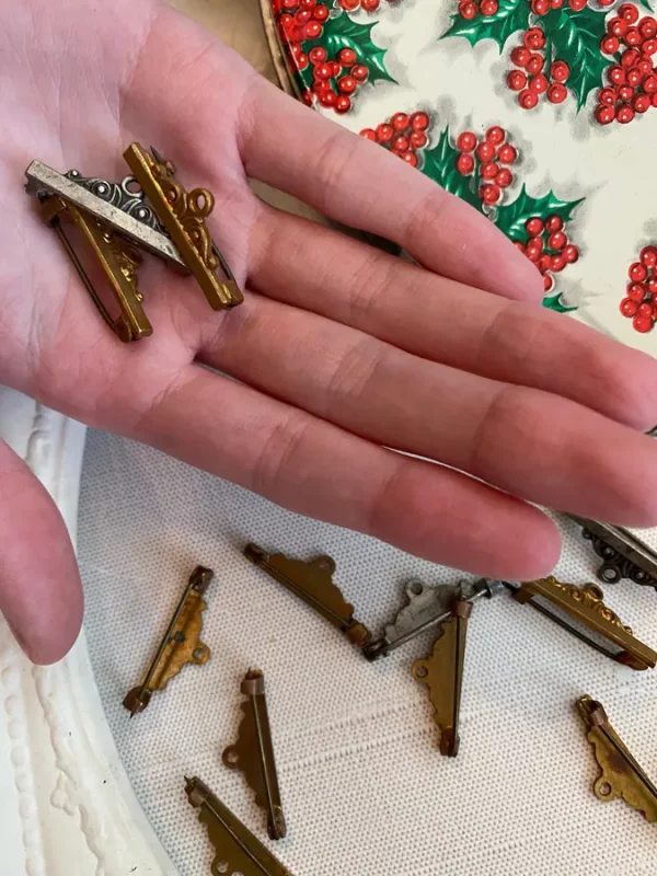 These gorgeous, aged, tiny little clipboard clip bar pins are so dainty and beautiful! I imagine them pinning small papers or fabric pieces inside a lap book or junk journal, much like you would clip ephemera on a larger scale to a beautiful wall hanging.