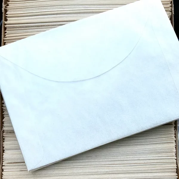 Gorgeously aged in their original boxes, glassine postage stamp envelopes are new old stock measuring about 3 1/4 x 4 7/8. They feature a curved (rounded) flap and have a beautiful patina on the edges.