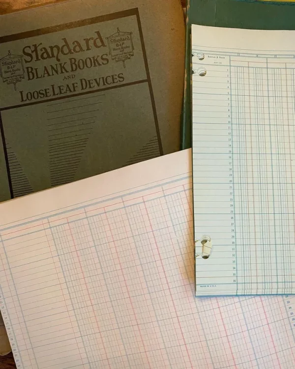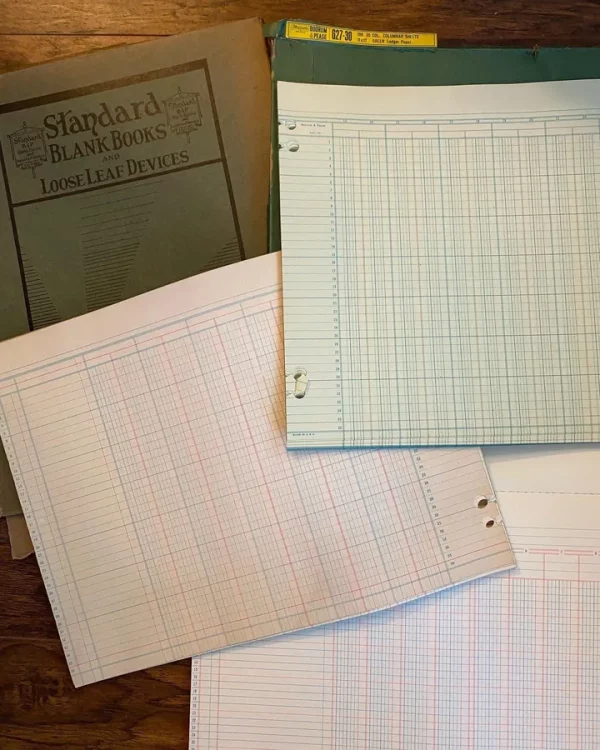 These vintage ledger refill pages are good for so many things. Boorum and Pease is a standard brand that made several styles. These pages are green or white with multi lines in red, blue, and green, and also a yellow with brown lines.