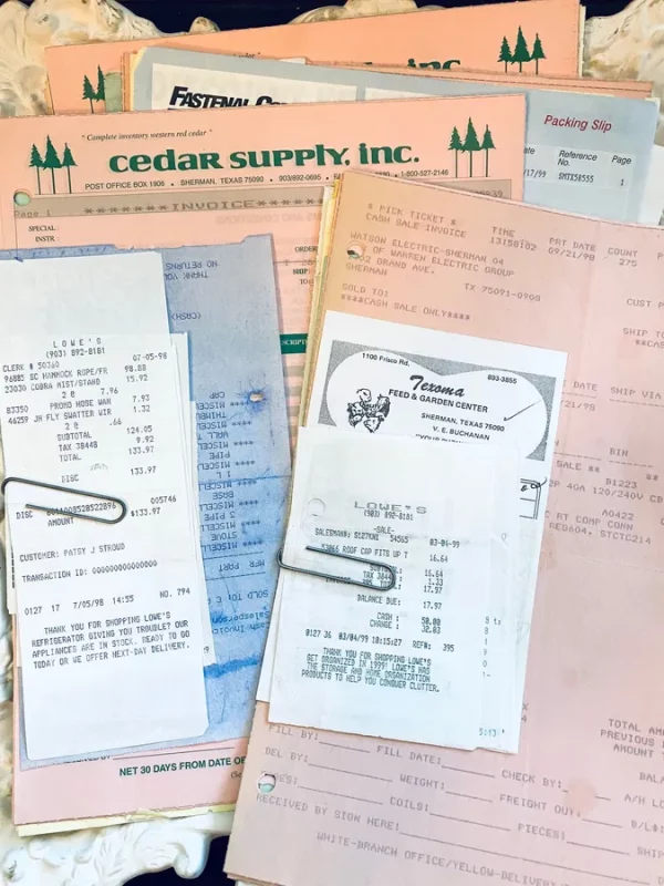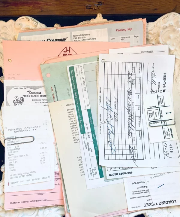 Receipts are of various sizes and dates. Colors vary as well. Fun to read and compare prices from years past! It’s not the same as it ever was.
