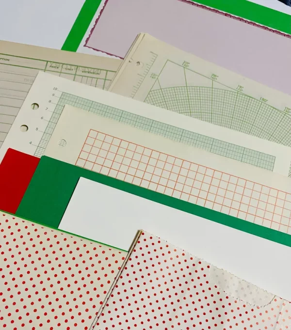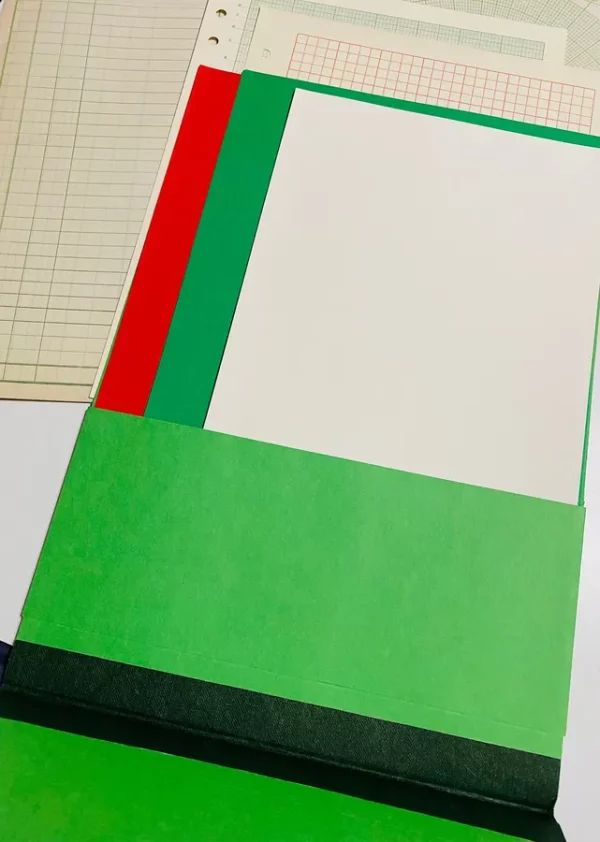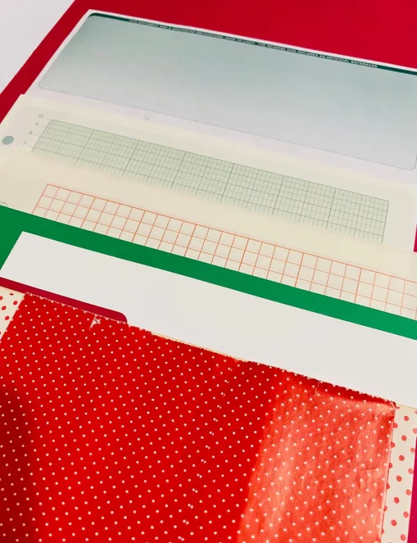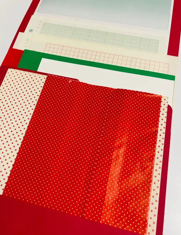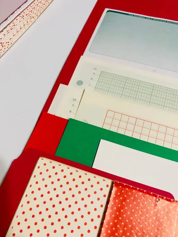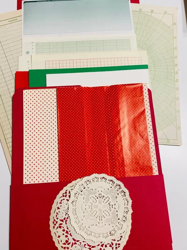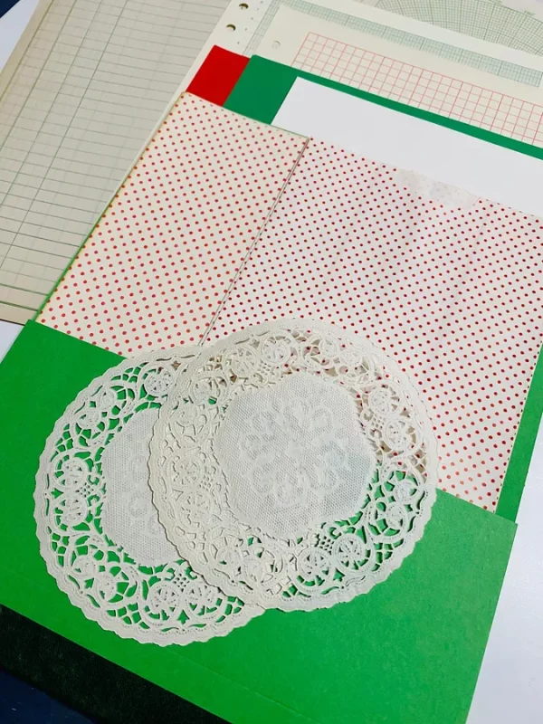 I’ve filled each section with red and white polka dot doll house paper and paper bag, solid green, red, and white typing bond, then grid paper from a few sources including K&E! Topping it off with a few doilies plus a sheet of old printer feed checks (see at the top in photos), to make a jolly, minty mix!