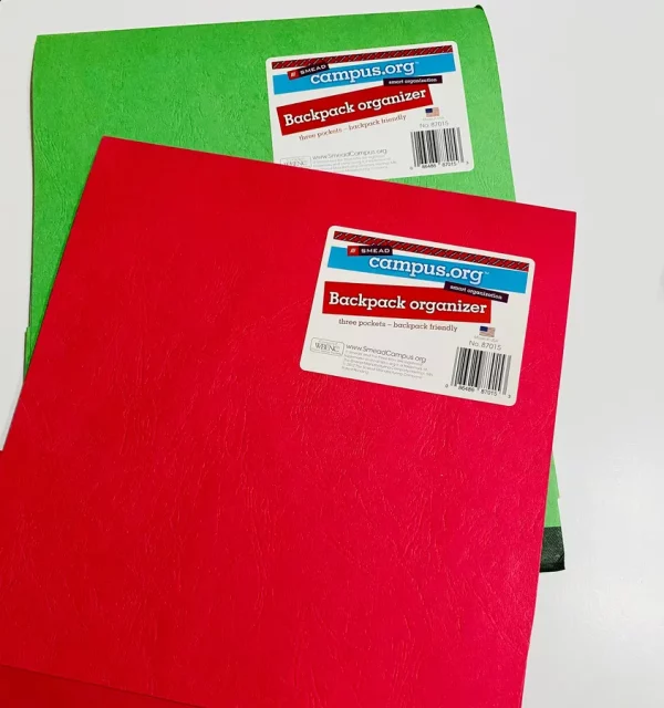 A few summers ago, I shopped a Dallas office supply close out and scored several paper backpack organizing folders in green and red by Smead. They are a vertical file meant to organize your papers so they don’t fall victim to the bottom of the abyss as most backpacks are. 🙂
